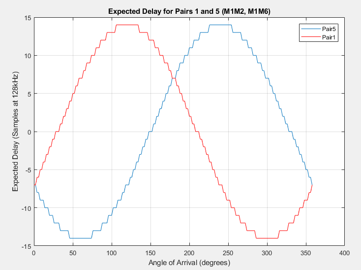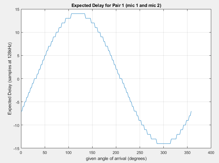The quantization of expected delay is not uniform across all angles. At the end-fire orientations, the quantization is at its worst. At an expected delay of 14 samples, the valid angles of arrival are between 106 and 134 degrees. The angular resolution is approximately 28 degrees.