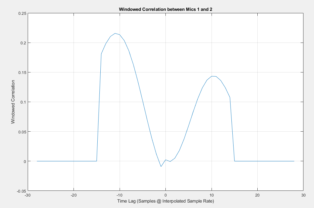 After taking IFFT of the zero padded GCC-PHAT data we get the time domain cross-correlation for a given mic pair. An example of the cross-correlation measurement is below. This is the cross-correlation measurement of microphones 1 and 2 with the microphone geometry above: