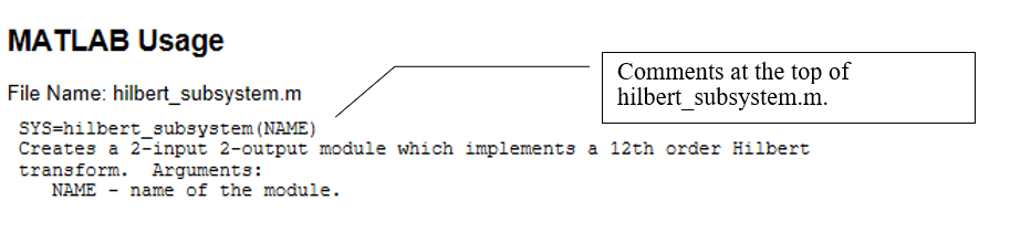 We now walk through the automatically generated help for the hilbert_subsystem.m and describe where each of the items shown is taken from.