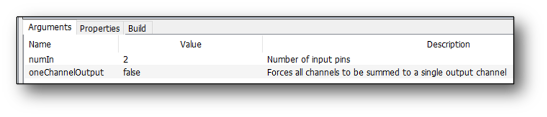 When oneChannelOutput is set to true then the output will be mono and all input channels will be summed together to form the output. In this mode, the input pins can have different numbers of channels. By default, oneChannelOutput is set to false and all input pins have to have the same number of channels and the output will be multichannel as well. A useful way of using the Adder is to sum together the left and right components of a stereo signal. The traditional way is to use a Deinterleave module