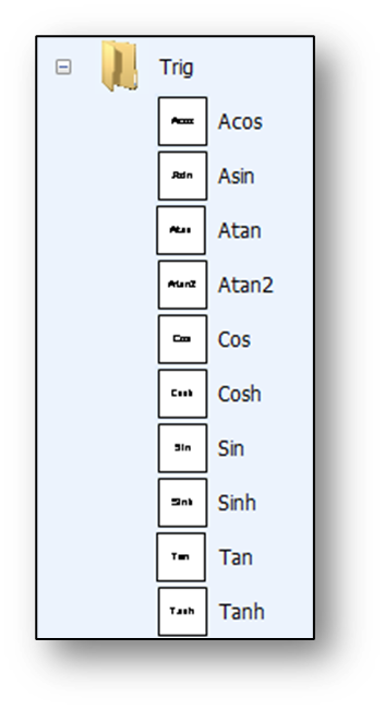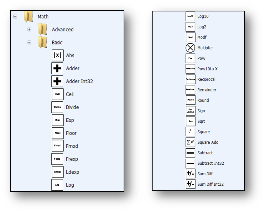 In addition to these basic math functions, the Math folder has modules corresponding to the functions in the standard C math.h library. These modules will be skipped, but here is a preview: