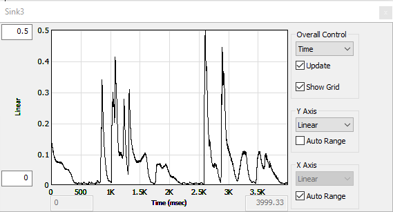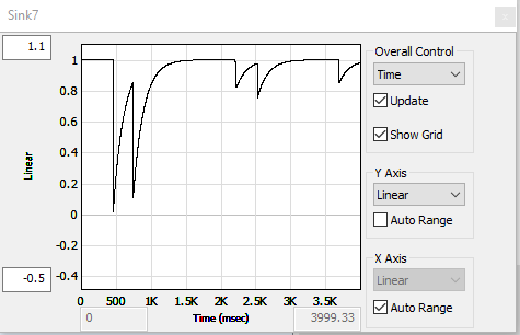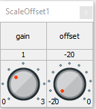 Note that the signal goes between 20 and 25. Our ultimate goal is to turn this into a gain control signal that starts at 1.0 when no pop is detected and goes down when a pop is detected. Our next step is to shift this signal so that it starts at 0 instead of 20, which is done using a ScaleOffset block with a Gain of 1.0 and Offset of -20.