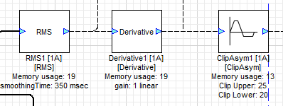 The derivative module measures the slope of the signal. We are interested in isolating the front edge of the pop signals so that we only suppress the onset of a pop. Constant low frequency energy or signals with a slower attack time shouldn’t trigger the limiter at all.