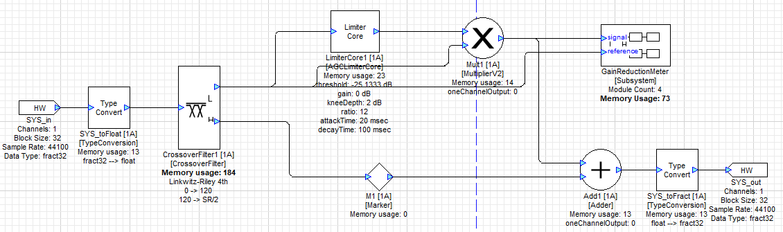 A GainReductionMeter subsystem has been added which lets you visualize the action of the limiter circuit. This is optional and can be eliminated after system tuning.