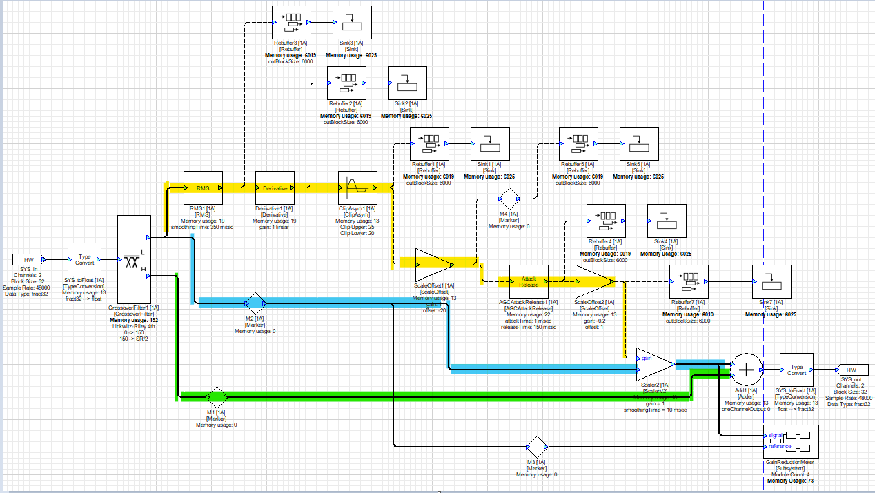 Here are the various sections of the control path. In the Design, each module includes a rebuffer/sink in order to more easily visualize what is happening. The rebuffer/sink modules as well as the GainReductionMeter subsystem can be removed for production after the Design is tuned.