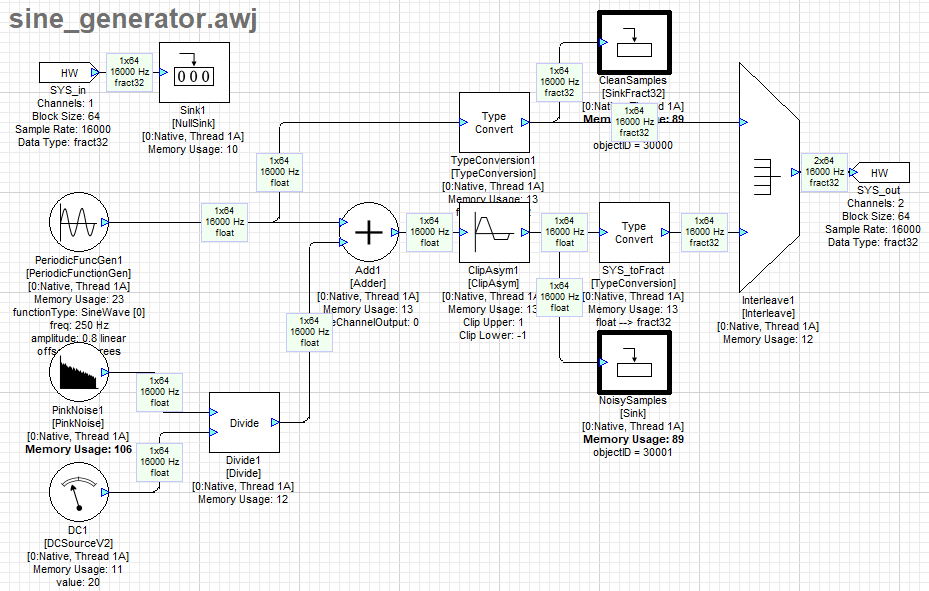 A simple sine wave generator layout (provided in pyawecore/Designs/sine_generator.png) can be used to generate a stereo WAV file. This first channel contains a clean sine tone, and the second channel is distorted with a pink noise.