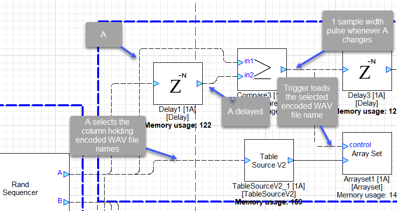 The 1-sample width pulse coming out of the comparator loads the selected encoded WAV file name from the TableSourceV2 into WavePlayerOneshotFlash1’s fileName variable.