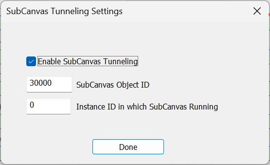 Check “Enable Subcanvas Tunneling” and enter the objectID of the Subcanvas module (this equals the objectID of the Subcanvas Subsystem module shown in the Designer canvas). Also specify the Instance ID if the Subcanvas where the Subcanvas is executing. Click “Done” to finish.