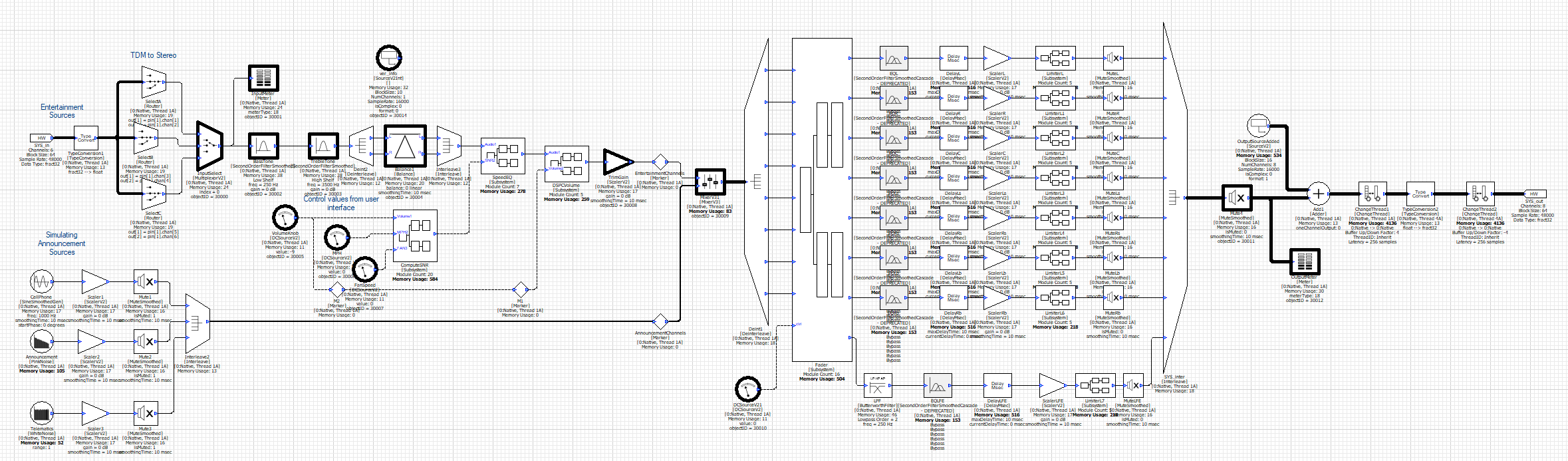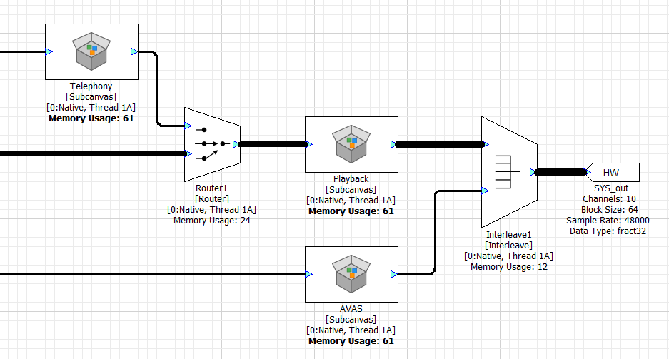 The Subcanvas provides flexibility when it comes to the block size. Suppose that the internal IP has a block size of N samples. Then the input wire can have a block size of N samples, or any block size that is a multiple KxN samples. If you give it a multiple, then the Subcanvas will pump the inner IP K times for every outer block with KxN samples. This is the first time that Audio Weaver has been able to process audio at a block size smaller than the fundamental block size of the system. In all cases, the output block size of the Subcanvas will equal the input block size.
